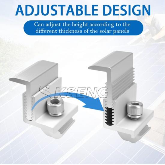 De verstelbare eindklem voor zonnepanelen is een essentieel onderdeel van montagesystemen voor zonnepanelen en is ontworpen om zonnepanelen stevig te ondersteunen. Gemaakt van hoogwaardige materialen, garandeert de klem duurzaamheid en stabiliteit. Een van de belangrijkste kenmerken is de mogelijkheid om de hoogte aan te passen aan de verschillende diktes van de zonnepanelen.